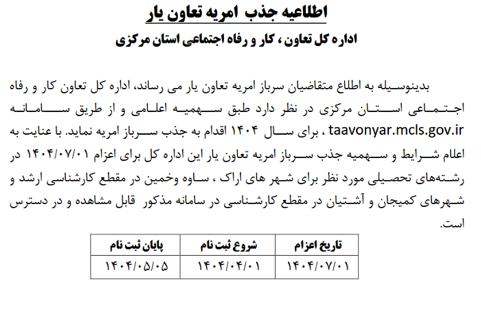 اطلاعیه جذب امریه تعاون یار ۱۱ تیر ۱۴۰۴ | ۱۲:۰۴ کد : ۵۲۷۴۸ اطلاعیه ارسال به دیگران نام شما ایمیل شما ایمیل دریافتکننده ارسال انصراف تعداد بازدید:۱۰۷۲ اطلاعیه جذب امریه تعاون یار