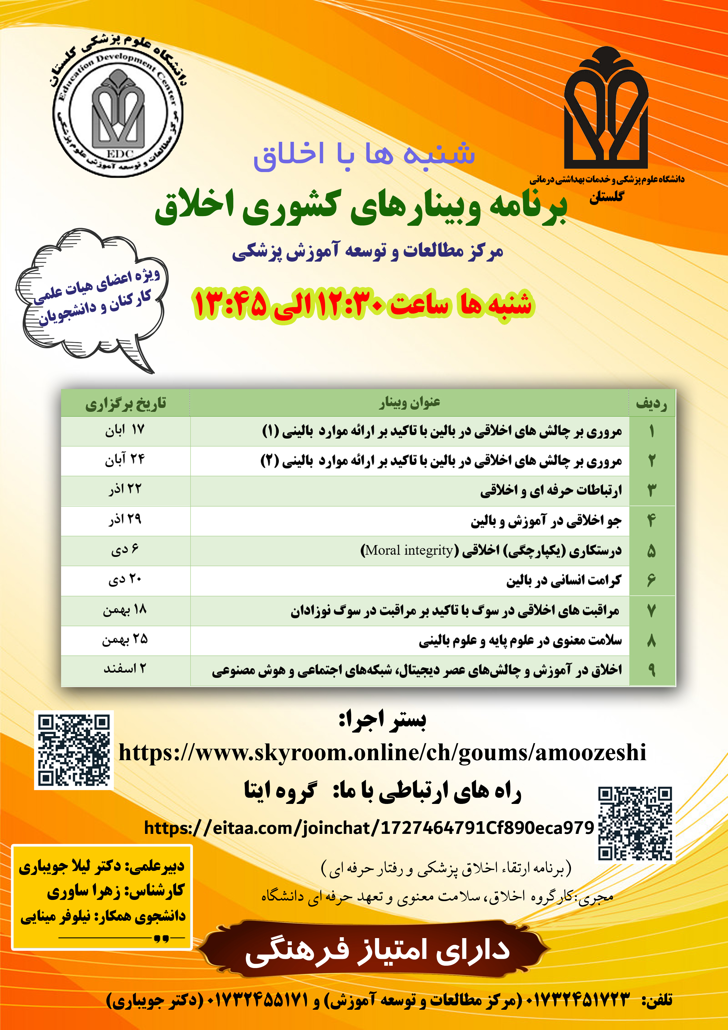 کارگروه اخلاق، سلامت معنوی و تعهد حرفه ای (برنامه ارتقا اخلاق پزشکی و رفتار حرفه ای) مستقر در مدیریت EDC  دانشگاه علوم پزشکی گلستان در صدد است در نیمه دوم سال جاری (شنبه ها ، آبان لغایت اسفندماه ) ساعت 12:30 الی 13:45، وبینارهای کشوری با محور «اخلاق، سلامت معنوی و تعهد حرفه ای» ویژه اعضای محترم هیئت علمی، کارکنان گرامی و دانشجویان گرانقدر دانشگاه های علوم پزشکی سراسر کشور به صورت مجازی برگزار نماید.